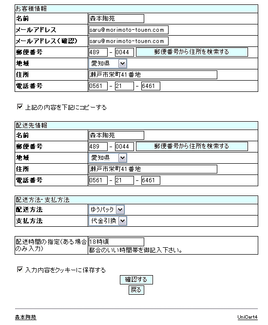 | 今度はお客さまの情報を入力して頂くページです。 メールアドレスは確認のため二回入力して頂く様になっています。 またお客様情報を配送先情報が同じでしたら、「上記の内容を下記にコピーする」にクリックを入れて下さい。 ゆっくり間違いのない様入力して下さいね。 そして支払い方法を「郵便振替」「銀行振込」「代金引換」からお選び下さい。 (配送方法は指定する必要はございません。) また、配送時間の指定がございましたらご記入下さい。 (ゆうパック配送時間サービス@9:00頃〜12:00頃A12:00頃〜14:00頃B14:00頃〜17:00頃 C17:00頃〜19:00頃D19:00頃〜21:00頃を利用します。) 「入力内容をクッキーに保存する」にクリックを入れると、次回以降のお買い物の時にお客様情報が記憶される為、 入力する手間がかからずにお買い物をすることができます。 では入力しましたら、「確認する」を押して次のページへ進みましょう。 お約束:当店は、顧客情報を厳守し配送業務以外、第三者に流すことは一切ありません。 |
