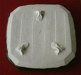 | 総織部の中に菊を白抜きで仕上げています。菊の白さが織部の深みを引き立てている重厚な一品です。全体が布目になっており、底面に三つの足がついています。 手作りのためにひとつひとつ色合い風合いが違います。あらかじめご了承ください。 |