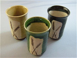 今回紹介させて頂きますのは、 ビールジョッキの弟分のショットグラスです! ショットグラスと、うたってはいるものの使い方は御自由に。 ワインを注いでも良し、焼酎のロックでいっても良し。 日本酒を注ぐと飲みすぎてしまいます。(笑) 織部・黄瀬戸・黒織部の三種類を御用意しましたが、 どれも上品で落ち着いた和の香りがします。 柄も麦の実りある縁起のいい、すっきりとした佇まいです。 3品ともロクロ目(ろくろをひいた時に出来る筋)が入っており、 それが滑りにくくするとともに、手づくりの素朴さを引き立たせています。 |