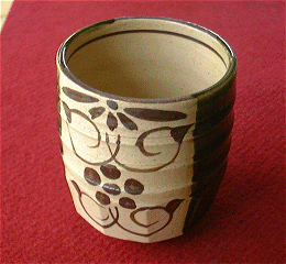 | 左右の織部に囲まれ唐草模様が描かれています。下部にそぎとった面を作りモダンな感じに仕上がっています。(大サイズは表側・小サイズは裏側の柄です。) 夫婦湯呑の梱包はこちら。 手作りのためにひとつひとつ色合い風合いが違います。あらかじめご了承ください。 |