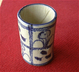 | 御深井に呉須で描かれた花。つるっとした手触りでモダンな感じです。平たく伸ばした粘土を筒状にしたタタラ作りです。(大サイズは表側・小サイズは裏側の柄です。) 夫婦湯呑の梱包はこちら。 手作りのためにひとつひとつ色合い風合いが違います。あらかじめご了承ください。 |