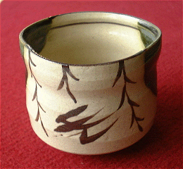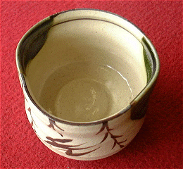 織部釉に柳とつばめがモチーフ。飲み口がくつ型になっており飲み易いのが特徴です。